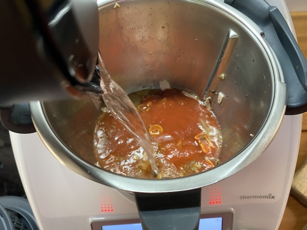 Ρίχνουμε στον κάδο του θερμομιξ το λάδι με τα μανιτάρια και το μπέικον και ρυθμίζουμε για 10 λεπτά /120ο θερμοκρασία/ αντίστροφη κίνηση, ταχύτητα “κουτάλι” μέχρι να σωταριστούν τα υλικά. Προσθέτουμε τότε το νερό, το ντοματοχυμό, τον κύβο και τα μπαχαρικά και ρυθμίζουμε 10 λεπτά/100ο θερμοκρασία / αντίστροφη κίνηση, ταχ. κουτάλι. Προσθέτουμε τότε τις πένες και ρυθμίζουμε για όση ώρα προτείνει η συσκευασία τους / θερμοκρασία 100ο/ αντίστροφη κίνηση, ταχ. κουτάλι μέχρι να μαγειρευτούν τα ζυμαρικά. Στο τέλος εξετάζουμε κι αν χρειαστεί επαναλαμβάνουμε για 1-2 λεπτά ακόμα.