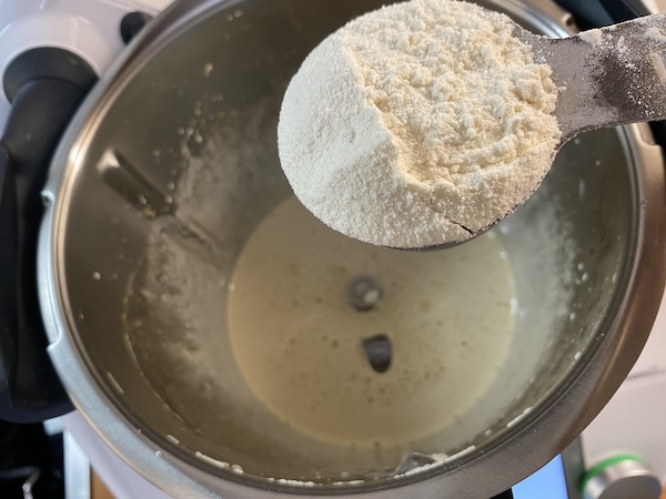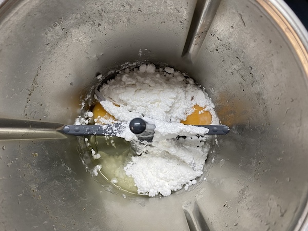 Τοποθετούμε το χτυπητήρι στον κάδο και ρίχνουμε την άχνη ζάχαρη και τα αυγά. Ρυθμίζουμε για 5 λεπτά/ ταχ. 3,5