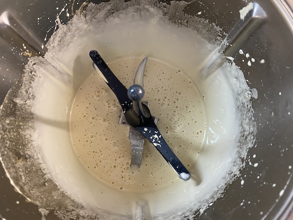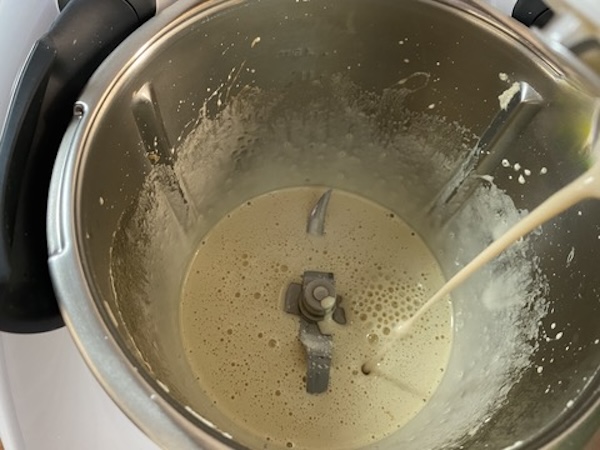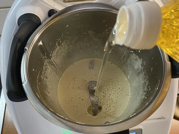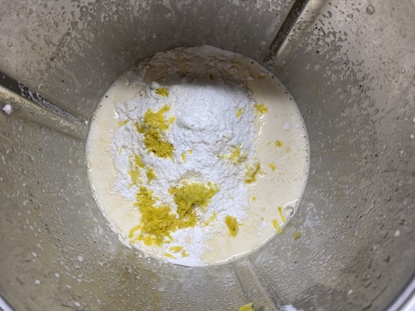 Αφαιρούμε το χτυπητήρι και προσθέτουμε το λάδι, το γάλα, το αλεύρι, το μπέικιν και τις βανίλιες (και το ξύσμα) και ρυθμίζουμε για 20 δευτερόλεπτα/ταχ. 4