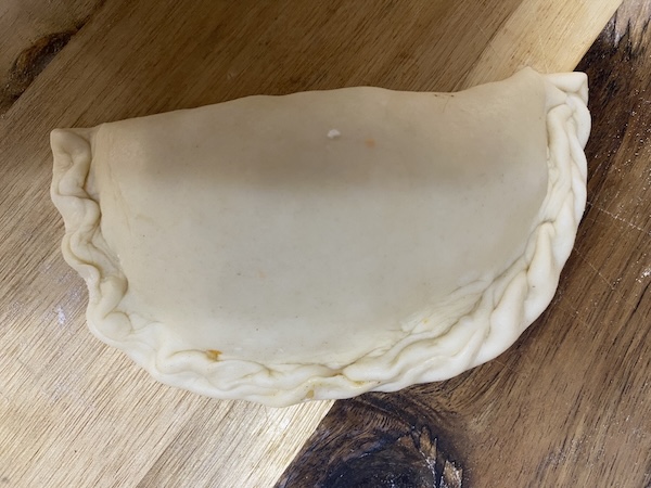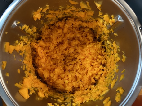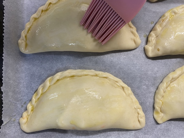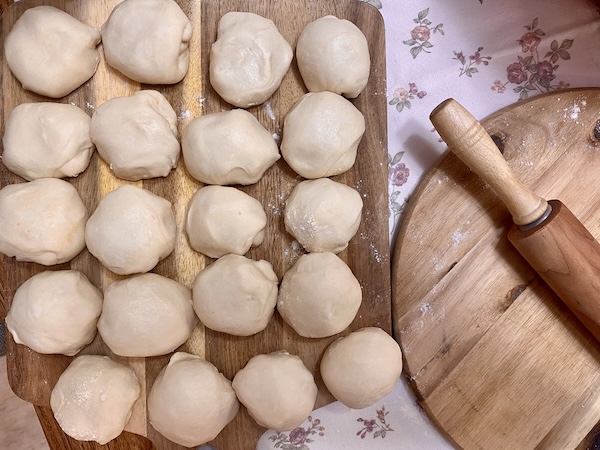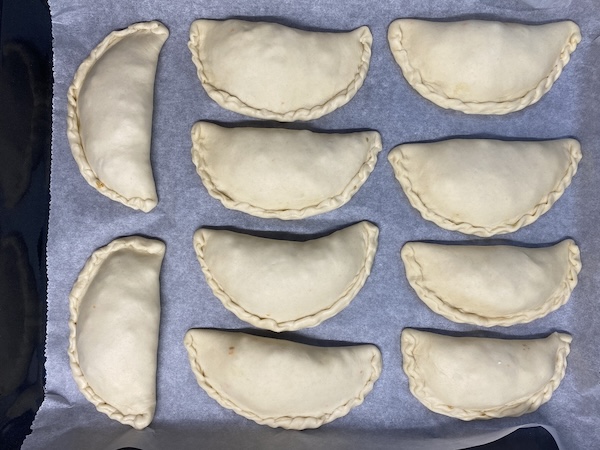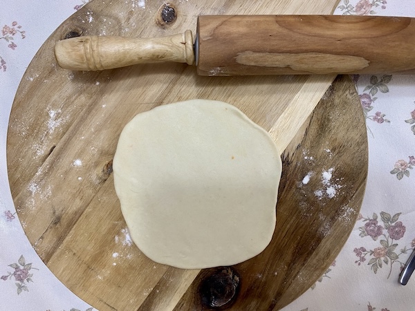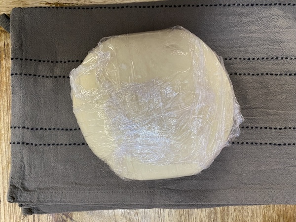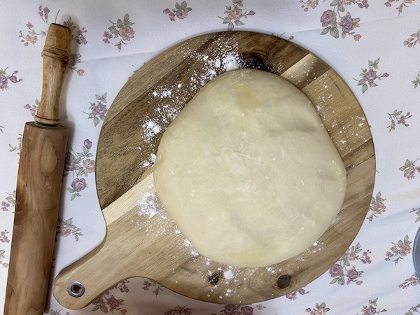 Βγάζουμε τη ζύμη από τον κάδο, σχηματίζουμε μια μπάλα με τα χέρια μας και την τυλίγουμε με μεμβράνη. Την αφήνουμε στην άκρη κι ετοιμάζουμε τη γέμιση.