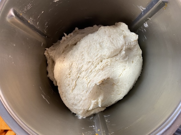 Αφαιρούμε τη ζύμη από τον κάδο και σχηματίζουμε μια μπάλα, την τοποθετούμε σε ένα μπωλ σκεπασμένη με μια πετσέτα και την αφήνουμε στην άκρη.