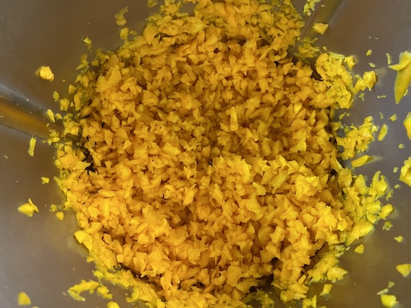 Αδειάζουμε τότε την κολοκύθα σε μια λεκάνη, προσθέτουμε κι όλα τα υπόλοιπα υλικά για τη γέμιση ανακατεύουμε και αφήνουμε στην άκρη για μισή με μία ώρα…