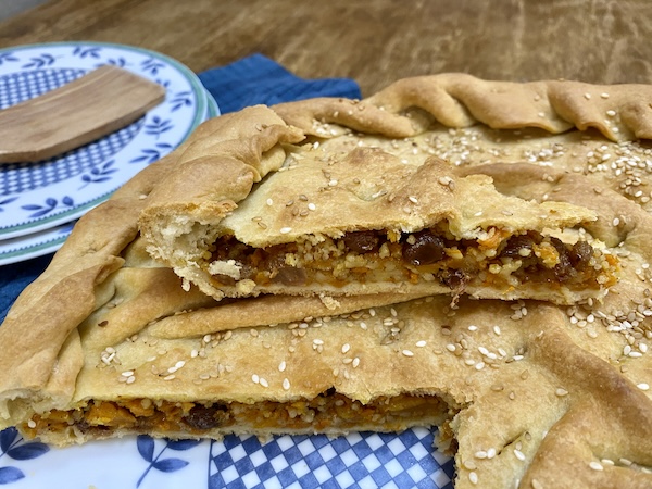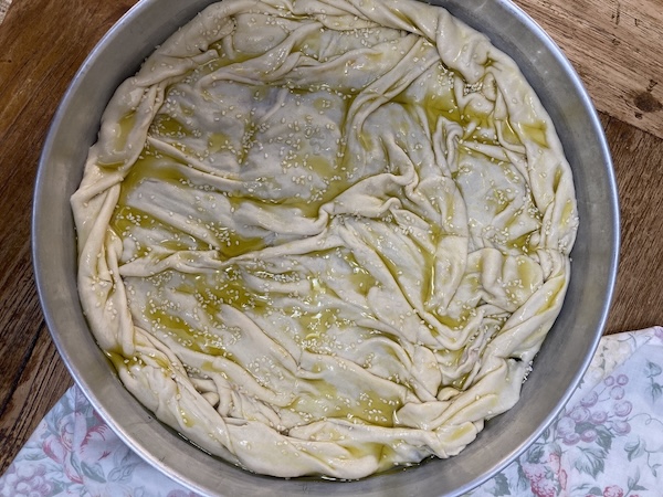 Αδειάζουμε τη γέμιση πάνω στο φύλλο , στο ταψί και συνεχίζουμε σχηματίζοντας το δεύτερο φύλλο. Με τη βοήθεια του πλάστη το μεταφέρουμε πάνω από τη γέμιση σχηματίζοντας πτυχές. Κλείνουμε τα πλάγια των δυο φύλλων γυρίζοντας σε κόθρο, χαράζουμε την πίτα , τη λαδώνουμε, πασπαλίζουμε με το σουσάμι και ψήνουμε σε προθερμασμένο φούρνο, στους 180ο για μία ώρα περίπου μέχρι να ροδίσει καλά η πίτα.