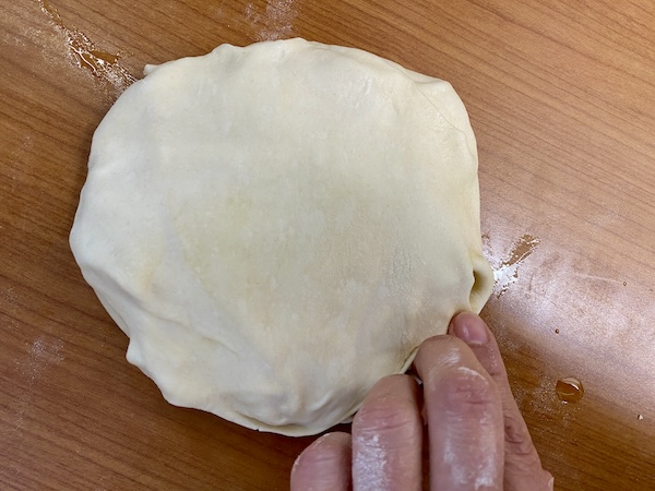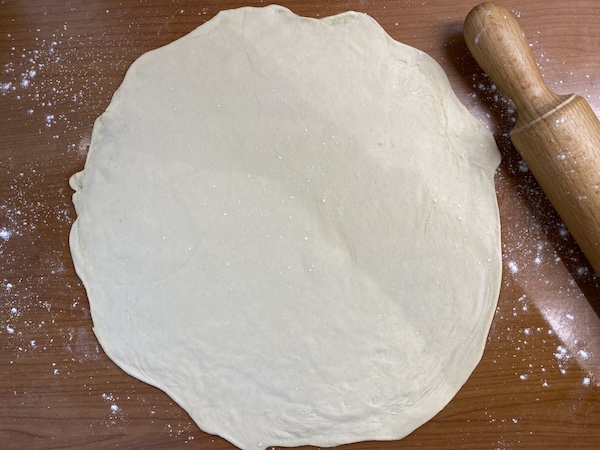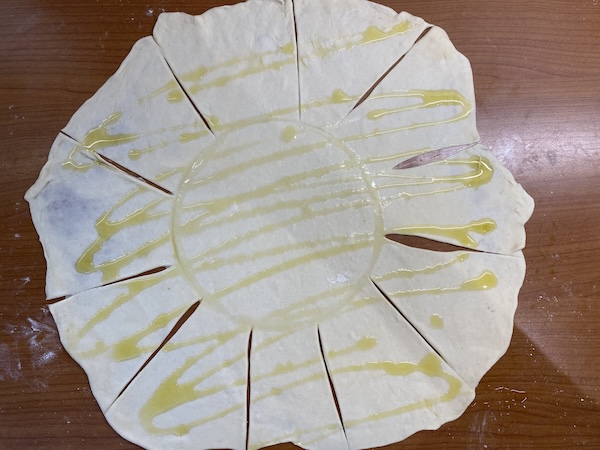 Το χωρίζουμε τότε σε δύο μέρη. Απλώνουμε με τον πλάστη το πρώτο κομμάτι σε λεπτό φύλλο. Ραντίζουμε όλη την επιφάνεια με αρκετό ελαιόλαδο και τοποθετούμε ένα μικρό πιάτο στο κέντρο. Χαράζουμε τότε το φύλλο ξεκινώντας από το περίγραμμα του πιάτου προς τα έξω σχηματίζοντας 12 “πέταλα” . Αφαιρούμε τότε το πιάτο και γυρίζουμε το κάθε πέταλο προς τα μέσα ώστε να σκεπαστεί το κέντρο του φύλλου που σκέπαζε το πιάτο. Συνεχίζουμε  με όλα τα “πέταλα” μέχρι να σχηματίσουμε ένα πακέτο. Αλευρώνοντας την επιφάνεια του το απλώνουμε ώστε να γίνει ένα λεπτό φύλλο περίπου 38-40 εκ. το οποίο θα είναι η βάση της πίτας.