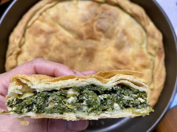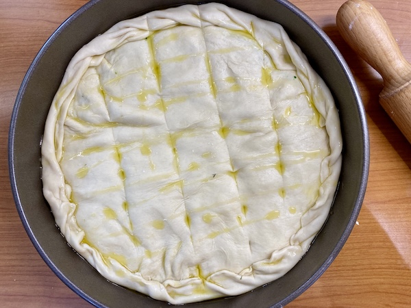 Τοποθετούμε τη γέμιση που έχουμε ετοιμάσει κατα περίπτωση και επαναλαμβάνουμε την ίδια διαδικασία με το δεύτερο κομμάτι ζύμης που θα είναι το πάνω φύλλο της πίτας. Ραντίζουμε με μπόλικο λάδι, χαράζουμε  και ψήνουμε μέχρι να ροδίσει καλά.