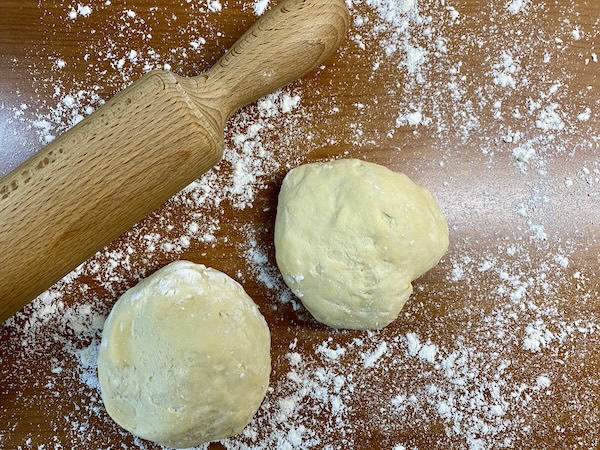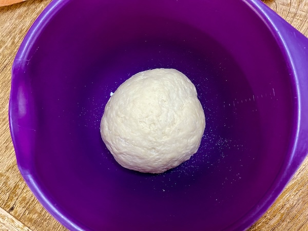 Τότε αλευρώνουνε ελαφρά την επιφάνεια εργασίας, αδειάζουμε πάνω τη ζύμη και κάνουμε διπλώματα ώστε να αποκτήσει το ζυμάρι ελαστικότητα.
