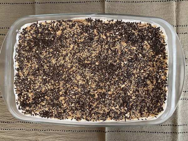 Νιφάδες κουβερτούρας , τριμμένα μπισκότα και τριμμένους ξηρούς καρπούς για το γαρνίρισμα