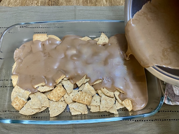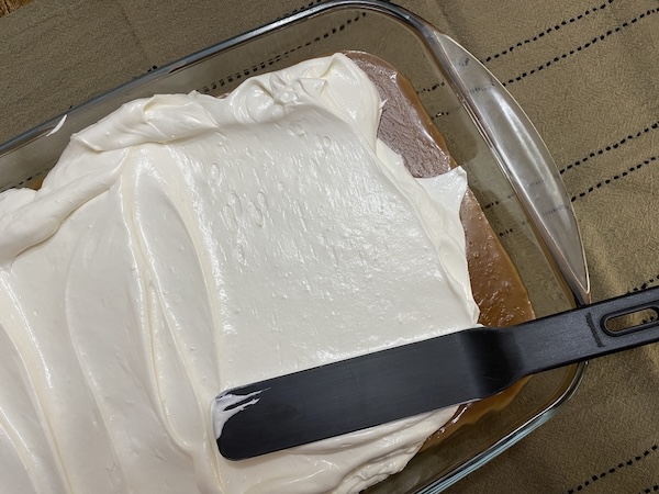 Τοποθετούμε τα σπασμένα μπισκότα σε παραλληλόγραμμο σκεύος (25×35) και το αφήνουμε κατά μέρος . Τοποθετούμε το γάλα σε μια κατσαρόλα , σε μέτρια θερμοκρασία και προσθέτουμε το κορν φλάουρ , ανακατεύοντας διαρκώς με σύρμα ώστε να διαλυθεί πριν προλάβει να ζεσταθεί πολύ το γάλα και σβωλιάσει . Συνεχίζοντας το ανακάτεμα , προσθέτουμε σταδιακά , τη μαργαρίνη , τη ζάχαρη και την κουβερτούρα . Ανακατεύουμε διαρκώς μέχρι να λιώσουν τα υλικά και να πετύχουμε μια κρέμα λεία , βελούδινη και πηχτή αφήνοντάς την να πάρει μόνο δυο-τρεις βράσεις. Αποσύρουμε από την εστία και αδειάζουμε αμέσως το περιεγχόμενο της κατσαρόλας πάνω στα σπασμένα μπισκότα . Περιμένουμε να κρυώσει! Χτυπάμε τότε στο μίξερ χειρός τη φυτική σαντιγύ μέχρι να αφρατέψει για 5 λεπτά και προσθέτουμε το ζαχαρούχο με σταθερή ροή μέχρι να ενωθούν τα δύο υλικά σε αφράτη κρέμα . Αδειάζουμε την κρέμα στο σκεύος , πάνω από τα μπισκότα με τη σοκολάτα και την απλώνουμε ομοιόμορφα με μια σπάτουλα. Γαρνίρουμε με νιφάδες σοκολάτας , τριμμένα μπισκότα , τριμμένους ξηρούς καρπούς και τοποθετούμε στο ψυγείο για αρκετές ώρες μέχρι να παγώσει καλά! Κόβουμε σε τετράγωνα κομμάτια και σερβίρουμε .