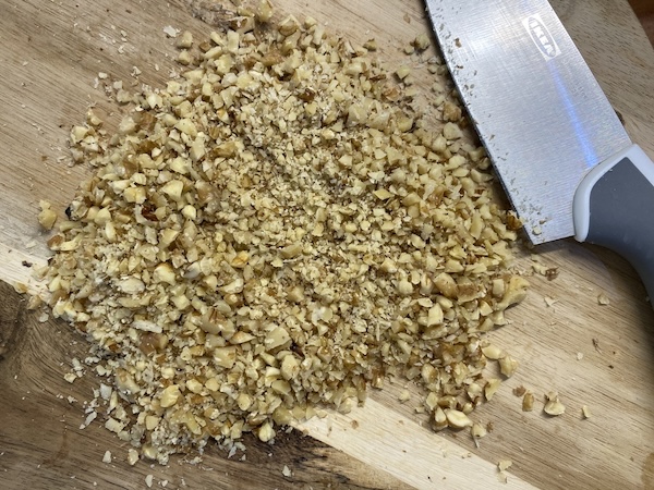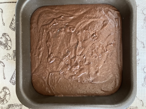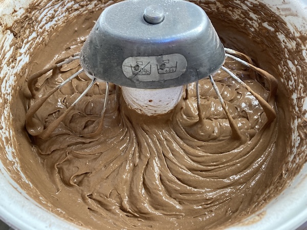 -Προσθέτουμε , τέλος , το μίγμα αλευριού – καρυδιού – σοκολάτας και ανακατεύουμε απαλά με σπάτουλα.