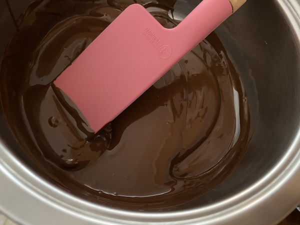-Λιώνουμε σε μπαίν μαρί ή στο φούρνο μικροκυμμάτων (2 λεπτά) το βούτυρο με την κουβερτούρα και ανακατεύουμε πάρα πολύ καλά ώστε να έχουμε ένα μίγμα απόλυτα βελούδινο. Αφήνουμε στην άκρη για να κρυώσει λίγο.