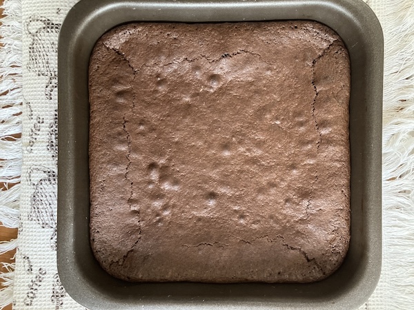 -Αδειάζουμε το μίγμα μας σε λαδωμένο ταψί που έχουμε στρώσει με λαδόκολλα ( 25×30) και ψήνουμε σε προθερμασμένο φούρνο , στους 175ο , για 25 με 30 λεπτά περίπου (εξαρτάται από το φούρνο μας) . Δε θέλουμε να ψηθεί πολύ για να μη στεγνώσει! Βγάζουμε από το φούρνο και ….κάνουμε υπομονή μέχρι να κρυώσει εντελώς ώστε να μπορέσουμε να το κόψουμε σε κομμάτια .