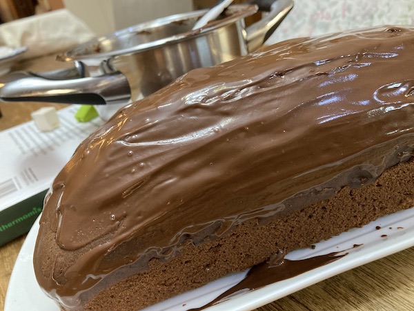 Τοποθετούμε τότε το πλέον κρύο κέικ σε μια πιατέλα, περιλούζουμε το κέικ ομοιόμορφα με το γλάσο, περιμένουμε να κρυώσει, κόβουμε σε κομμάτια και σερβίρουμε.