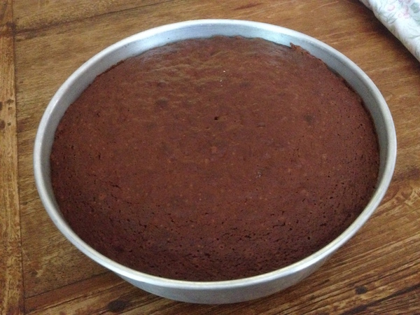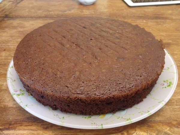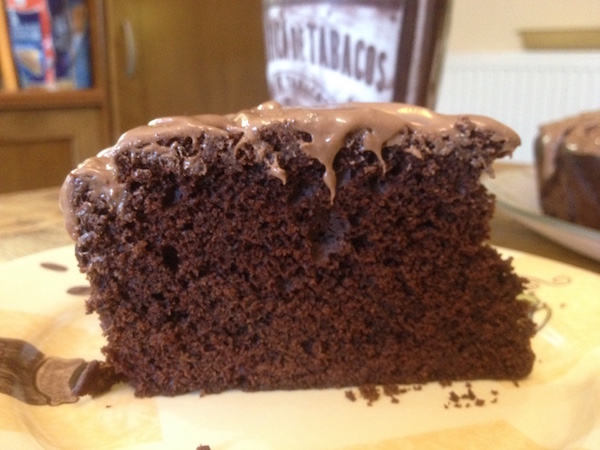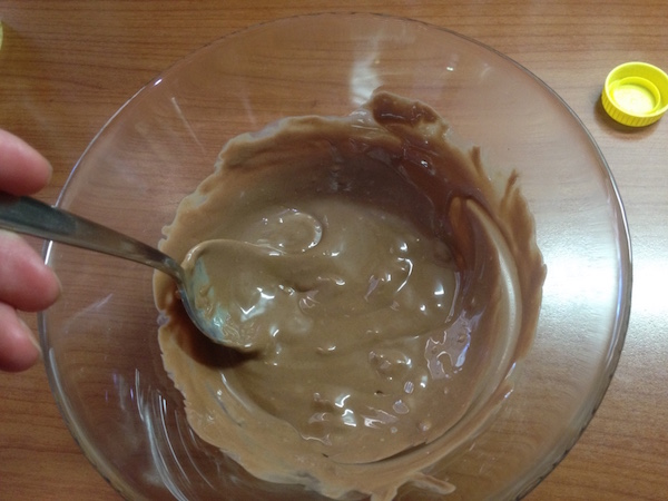 Λιώνουμε την κουβερτούρα πραλίνας για 1 λεπτό στα μικροκύματα ή σε μπαιν-μαρί και προσθέτουμε το ηλιέλαιο. Ανακατεύουμε με ένα κουτάλι ή μια σπάτουλα σχολαστικά μέχρι να απορροφηθεί εντελώς το ηλιέλαιο και να πετύχουμε ένα παχύρευστο , γυαλιστερό μίγμα. Απλώνουμε σε όλη την επιφάνεια του κέικ και περιμένουμε για λίγο μέχρι να σταθεί. Κόβουμε σε κομμάτια και σερβίρουμε.