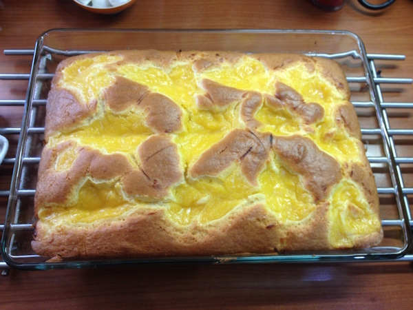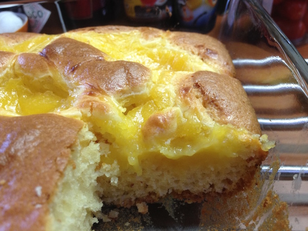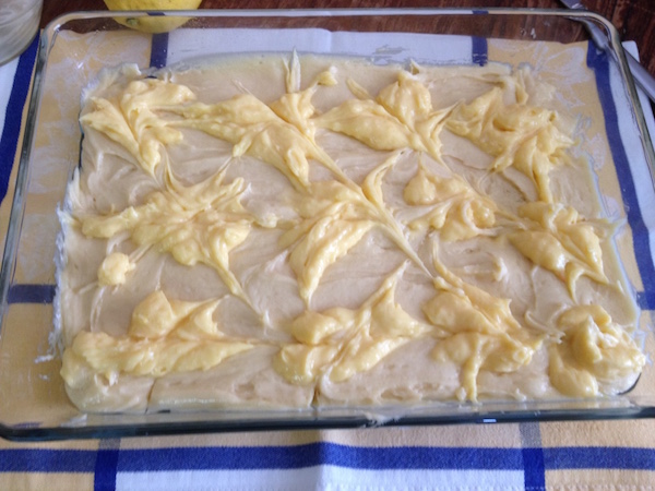 Χτυπάμε στο μίξερ τα αυγά με τη ζάχαρη και προσθέτουμε σιγά-σιγά το ηλιέλαιο και το χυμό λεμονιού , τις βανίλιες και το ξύσμα συνεχίζοντας το χτύπημα. Προσθέτουμε το αλεύρι με το μπέικιν και τέλος το τυρί mascarpone. Θα σχηματιστεί μια σφιχτή ζύμη. Λαδώνουμε ένα πυρέξ ή άλλο ταψάκι 20x 30 , αδειάζουμε μέσα τη ζύμη. και διορθώνουμε την επιφάνεια με μια σπάτουλα. Σκορπίζουμε τότε εδώ κι εκεί την κρέμα λεμονιού κουταλιές-κουταλιές όσο μπορούμε πιο ομοιόμρφα. Τέλος με ένα μαχαίρι κάνουμε σχηματισμούς ώστε να ανακατευτεί ελαφρά η κρέμα λεμονιού με τη ζύμη του κέικ . Ψήνουμε σε προθερμασμένο φούρνο , στους 180ο για 40 λεπτά περίπου μέχρι να ροδίσει η επιφάνεια. (Κάνουμε το τεστ με τη λάμα του μαχαιριού).
