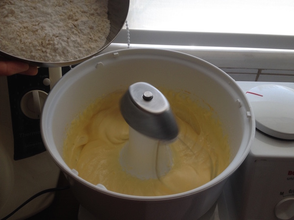 Στη συνέχεια ετοιμάζουμε το κέικ: Κοσκινίζουμε το αλεύρι με το μπέικιν.
