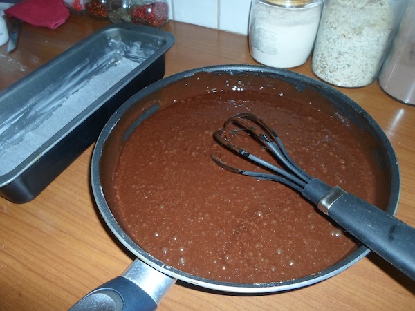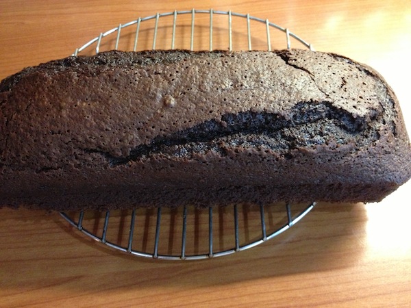 Στη συνέχεια χτυπάμε τα αυγά και τα προσθέτουμε στο μίγμα με σταθερή , μικρή ροή ενώ ανακατεύουμε ζωηρά με το σύρμα. Όταν ενσωματωθούν τελείως τα αυγά προσθέτουμε τότε το αλεύρι με το μπέικιν και τη σόδα τα οποία έχουμε κοσκινίσει από πριν. Ανακατεύουμε για λίγο ακόμα και το μίγμα μας είναι έτοιμο. Το αδειάζουμε σε μακρόστενη φόρμα του κέικ στο κάτω μέρος της οποίας έχουμε στρώσει λαδόκολλα και τα πλάγιά της τα έχουμε βουτυρώσει. Ψήνουμε σε προθερμασμένο φούρνο , στους 160ο , για 45 λεπτά περίπου.