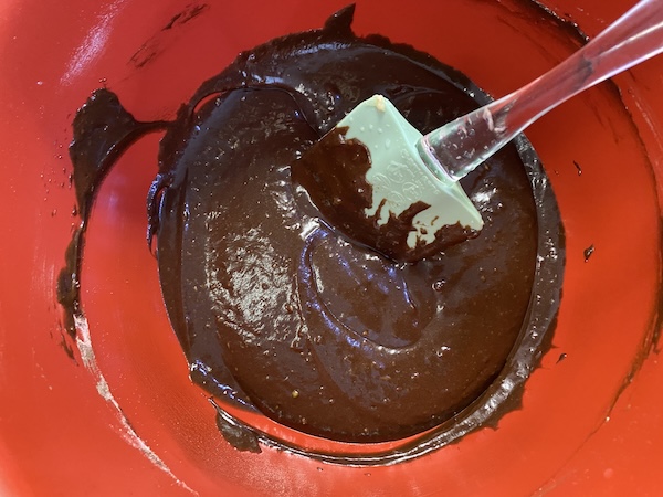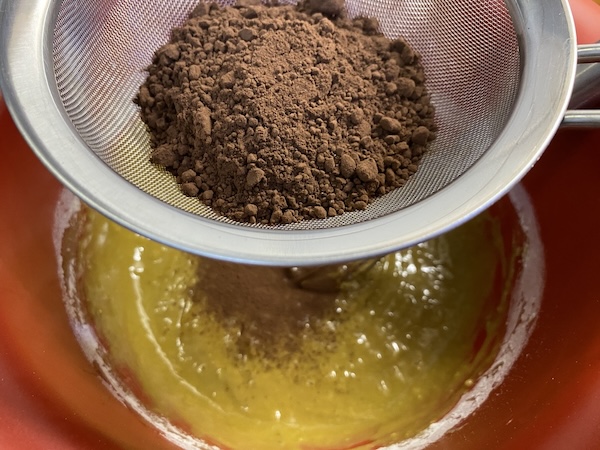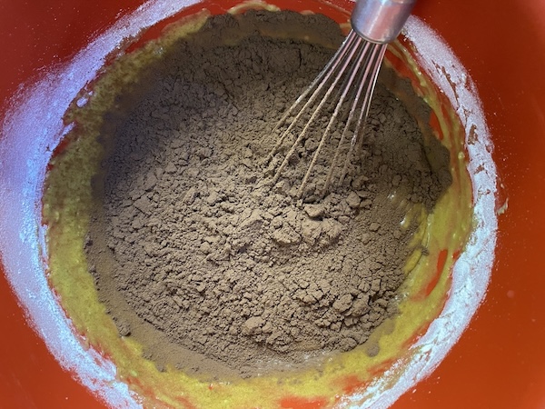 -Σε ένα μπωλ ανακατεύουμε το αυγό , τη ζάχαρη και το ηλιέλαιο με το σύρμα. Προσθέτουμε εκεί και τον πουρέ μπανάνας και ανακατεύουμε άλλο λίγο. Προσθέτουμε τότε το κακάο κοσκινισμένο, το αλέυρι κοσκινισμένο επίσης, τη σόδα, το αλάτι και το μπέικιν.