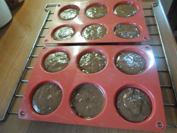-Μοιράζουμε σε 12 ατομικές θήκες σιλικόνης ( ή απλές , λαδωμένες και αλευρωμένες ή στρωμένες με τα ειδικά χαρτάκια για μάφινς )