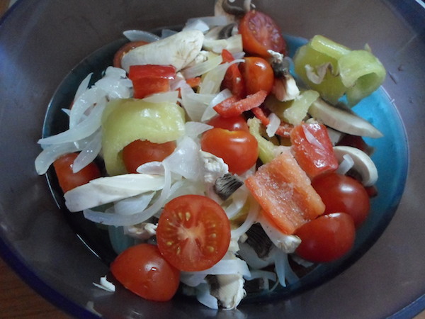 3 πιπεριές (έγχρωμες και πράσινες) σε τετράγωνα κομμάτια