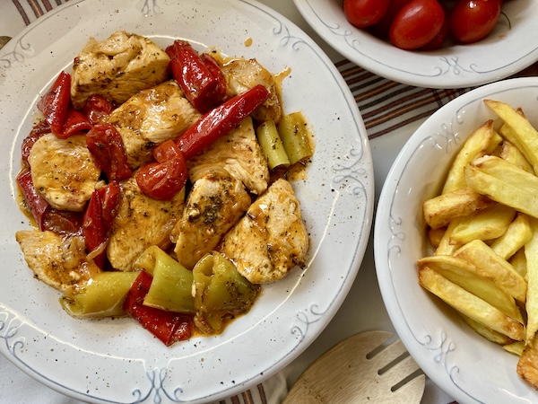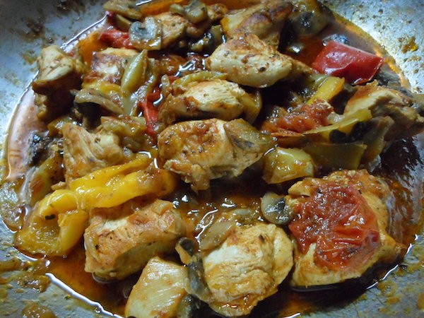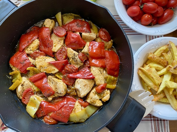 Πρόκειται για ένα από τα αγαπημένα φαγητά , τόσο νόστιμο και απλό αλλά με τόσο δυνατή , μεσογειακή γεύση που δεν αφήνει κανέναν αδιάφορο! Οι πιπεριές , τα κρεμμύδια , τα μανιτάρια , τα ντοματίνια αλλά και η ρίγανη απογειώνουν το απλό , άπαχο κρέας του κοτόπουλου και το κάνουν έναν εξαιρετικό μεζέ που μπορεί να συνοδέψει πολύ όμορφα το κρασάκι ή τη μπύρα μας. Συνδυάζεται με πατάτες ψητές ή τηγανιτές ή ρύζι και χαρίζει ένα πλήρες νόστιμο και υγιεινό γεύμα ενώ στέκεται μια χαρά και μόνο του , ειδικά αν του προσθέσουμε λίγη φέτα και φρέσκο , ζυμωτό καψαλισμένο ψωμί…