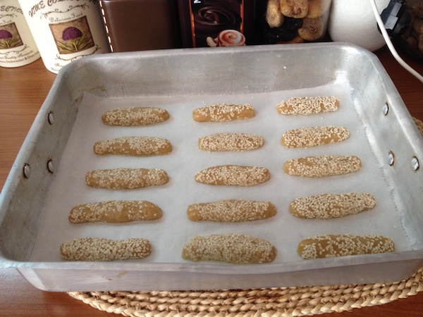 Η θεία Ουρανία , σύζυγος του θείου Λούη (αδελφός της μαμάς) είναι μια αρχοντική γυναίκα…Είναι η “στόφα” της τέτοια , τη θυμάμαι από παιδί. Το σπίτι τους στη Σπάρτη ήταν τόσο καλόγουστο και περιποιημένο που φάνταζε στα παιδικά μου μάτια σαν παλάτι. Φέτος μας περίμεναν στο χωριό . Οι ετοιμασίες φανέρωναν την σημασία που δίνει η θεία στη λεπτομέρεια. Πάνω στο τραπέζι της κουζίνας μια όμορφη φοντανιέρα , λευκή με κόκκινα τριαντάφυλλα τράβηξε αμέσως την προσοχή μου…Δεν περίμενα τίποτα λιγότερο από τη θεία Ουρανία! Η επόμενη έκπληξη ήταν το περιεγχόμενο: Τραγανά , πεντανόστιμια , αρωματικά και υπέροχα σουσαμένια κουλουράκια ζυμωμένα με κρασί…Ευτυχώς είχαμε μολύβι και χαρτί…