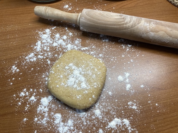 Αλευρώνουνε τότε την επιφάνεια εργασίας μας , χωρίζουμε τη ζύμη στα δύο ώστε να μπορούμε να την δουλεύουμε πιο εύκολα , πασπαλίζουμε με λίγο αλεύρι και με τον πλάστη ανοίγουμε φύλλο πάχους μισού εκατοστού περίπου. Με το κουπ πατ κόβουμε μπισκότα και τα αραδιάζουμε σε ταψί με λαδόκολλα. Επαναλαμβάνουμε την ίδια διαδικασία και με την υπόλοιπη ζύμη και αλείφουμε την επιφάνεια με αυγό χτυπημένο.