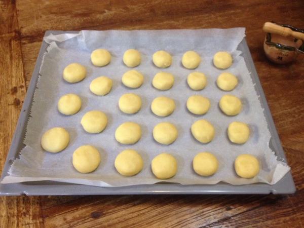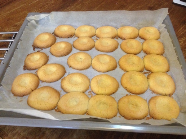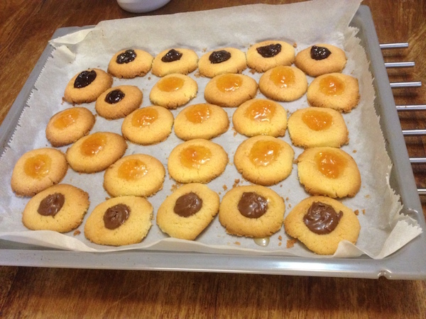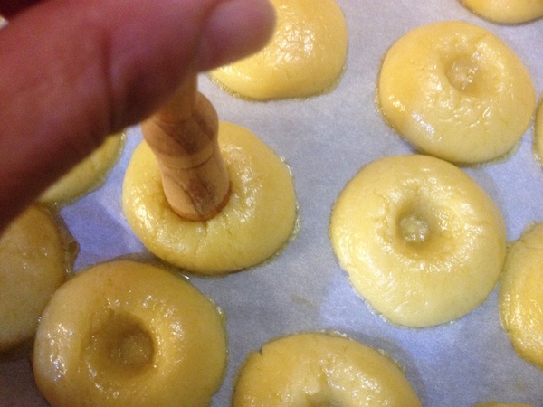 Χτυπάμε το βούτυρο με τη ζάχαρη στο μίξερ για λίγα λεπτά και στη συνέχεια προσθέτουμε το αυγό και τις βανίλιες. Αν σβολιάζει δεν ανησυχούμε , στην πορεία “θα στρώσει” το μίγμα. Προσθέτουμε τότε το αλεύρι σε δυο-τρεις δόσεις και τέλος το αλάτι και συνεχίζουμε το χτύπημα . Θα έχουμε ένα σφιχτό και ελαφρά κολλώδες μίγμα. Το σκεπάζουμε με μεμβράνη και το τοποθετούμε για 45 λεπτά στο ψυγείο. Αδειάζουμε τότε το μίγμα στον πάγκο εργασίας και τον χωρίζουμε σε 30 κομμάτια. Πλάθουμε μπαλάκια με τα χέρια μας και τα τοποθετούμε με απόσταση μεταξύ τους στο ταψί του φούρνου στο οποίο έχουμε τοποθετήσει λαδόκολλα. Πιέζουμε με την παλάμη μας πολύ ελαφρά την επιφάνειά τους και ψήνουμε τα μπισκότα σε προθερμασμένο φούρνο , στους 170ο για 5λεπτά. Βγάζουμε τότε το ταψί από το φούρνο και σχηματίζουμε μια λακουβίτσα στο κέντρο τους χωρίς να τα τρυπήσουμε ως κάτω με τη βοήθεια μιας χοντρής ξύλινης βέργας ή την ανάποδη μιας ξύλινης κουτάλας σε μέγεθος όμοιο με τον αντίχειρά μας από όπου και η ονομασία. (Εγώ χρησιμοποιώ ένα ξύλινο μικρό γουδοχέρι από γουδί μπαχαρικών). Δυναμώνουμε τότε τη θερμοκρασία του φούρνου στους 200ο και ψήνουμε άλλα 10-15 λεπτά μέχρι να ροδίσουν τα μπισκότα . Περιμένουμε να κρυώσουν αρκετά και τα γεμίζουμε με ένα κουταλάκι του εσπρέσο με όποια γέμιση προτιμάμε . Εγώ γέμισα λίγα με μαρμελάδα από νεκταρίνια , λίγα με μαρμελάδα από αγριοκέρασα και λίγα με πραλίνα φουντουκιού.