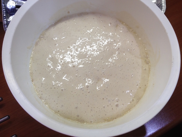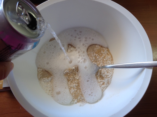 Τοποθετούμε σε ένα μπωλ το αλεύρι , τη μαγιά και τη ζάχαρη. Αδειάζουμε μέσα και το αναψυκτικό και τα ανακατεύουμε όλα μαζί με ένα πιρούνι μέχρι να πετύχουμε ένα ρευστό και πυκνό μίγμα χωρίς σβωλάκια. Σκεπάζουμε με μια πετσέτα και το αφήνουμε σε ζεστό μέρος μέχρι να διπλασιαστεί σε όγκο. Παράλληλα πλένουμε και στεγνώνουμε τα ντοματάκια . Τα τοποθετούμε σε ένα σουρωτήρι και τα κόβουμε αε μικρά καρέ. Τα αλατίζουμε και τα ανακατεύουμε με σκοπό να αφυδατωθούν και να στραγγίζουν τα υγρά τους (το αλάτι βοηθάει σ’ αυτό) . Αν χρειαστεί τα ανακατεύουμε και τα πιέζουμε απαλά με ένα κουτάλι.