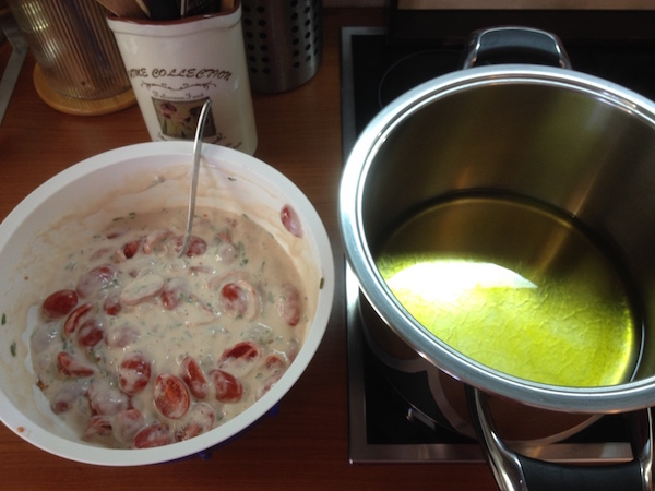 -Προσέχουμε πολύ , να μην αφήσουμε υγρά από τις ντομάτες , να τις στραγγίσουμε πολύ καλά γιατί θα μας χαλάσει το μίγμα και οι λουκουμάδες μας θα μετατραπούν σε…τηγανίτες!