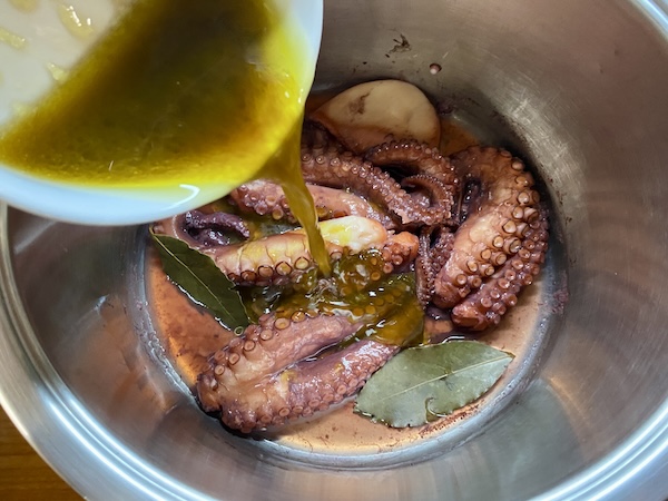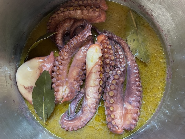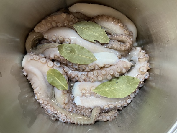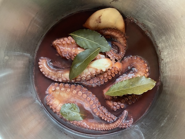 Πλένουμε το χταπόδι, καθαρίζουμε και πετάμε τα περιτά , το κόβουμε σε μεγάλα κομμάτια και το τοποθετούμε στην κατσαρόλα με τη δάφνη. Δυναμώνουμε τη φωτιά και περιμένουμε να βγάλει τα υγρά του (είναι πολλά και δε χρειάζεται καθόλου νερό) αμέσως το σκεπάζουμε , χαμηλώνουμε τη φωτιά και το αφήνουμε να βράσει για 45 λεπτά με μια ώρα. Στη συνέχεια το ξεσκεπάζουμε και είναι έτοιμο. Αν όμως δούμε ότι έχουν μείνει αρκετά υγρά, δυναμώνουμε τη φωτιά και το αφήνουμε για λίγα λεπτά ακόμα ώστε να μελώσει και να μείνει με πολύ λίγο ζουμάκι.