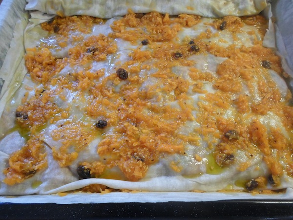 -Σκορπίζω πάνω το 1/3 της γέμισης και συνεχίζω εναλλάξ  ένα -ένα φύλλο και 1/3 από τη γέμιση κάθε φορά