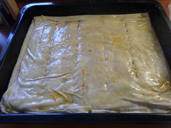 -Λαδώνω ένα ταψί 35 x 30 και απλώνω τα δύο φύλλα , λαδώνοντας και ενδιάμεσα.