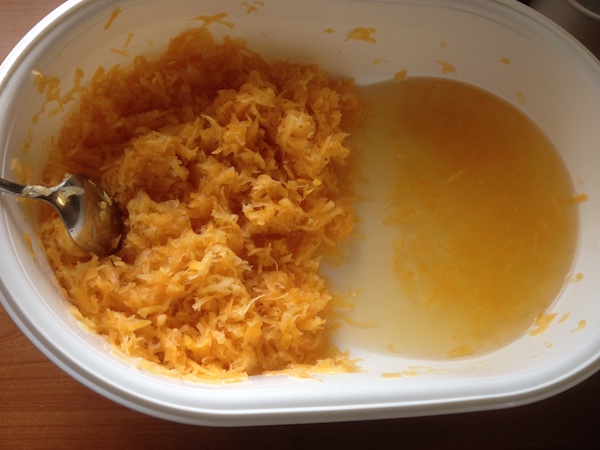 -Προσθέτω τη ζάχαρη και ανακατεύω λίγο. Η ζάχαρη θα αφυδατώσει το κολοκύθι… Στραγγίζω , πιέζοντας μέσα στο σουρωτήρι και μεταφέρω το στεγνό πλέον κολοκύθι με τη ζάχαρη σε μια καθαρή λεκάνη. Τα υγρά που στράγγισαν τα αφήνω στην άκρη.