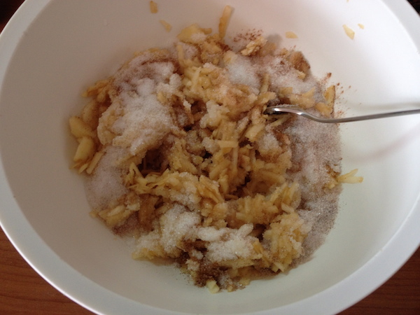-Καθαρίζουμε τα μήλα και τα τρίβουμε στον χονδρό  τρίφτη . Τα τοποθετούμε σε ένα μπωλ και προσθέτουμε τη ζάχαρη και την κανέλα . Τα ανακατεύουμε και αφήνουμε το μίγμα στην άκρη.