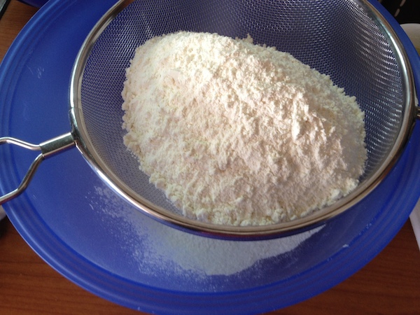 -Κοσκινίζουμε το αλεύρι με το μπέικιν.